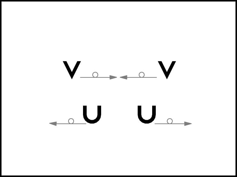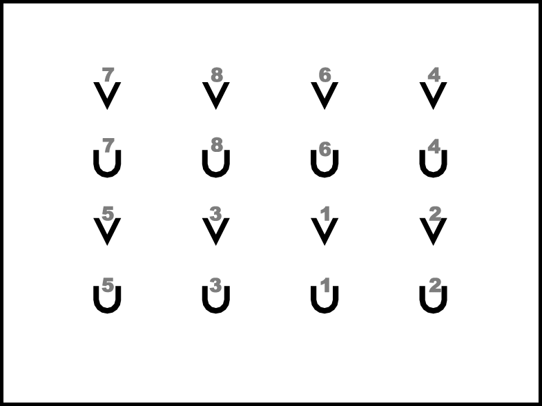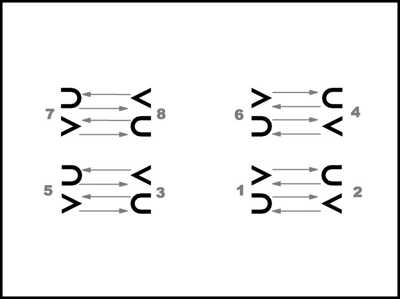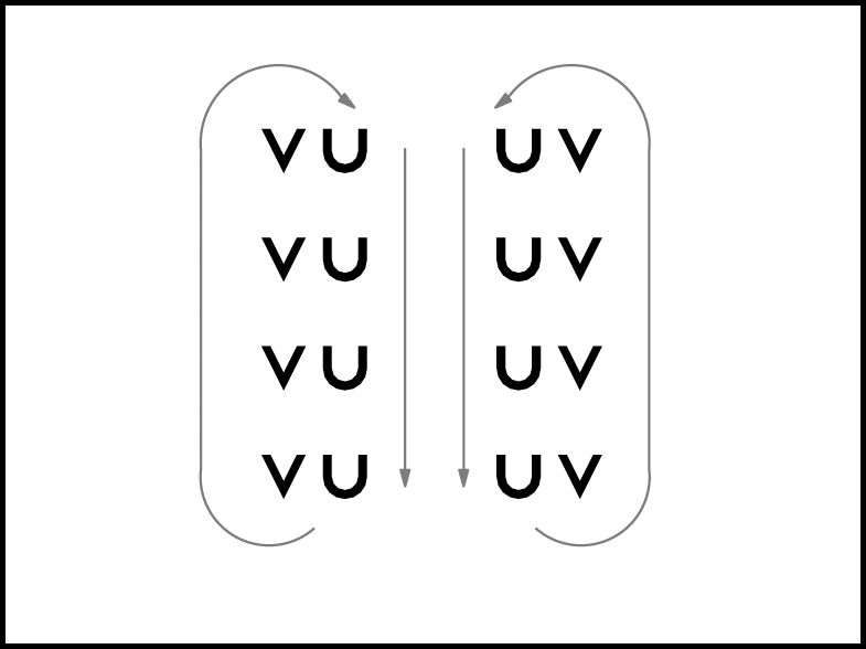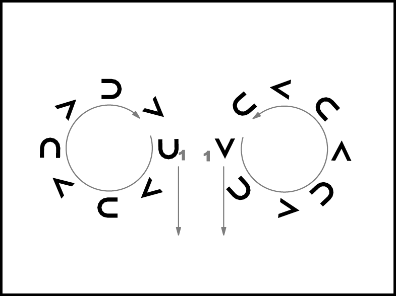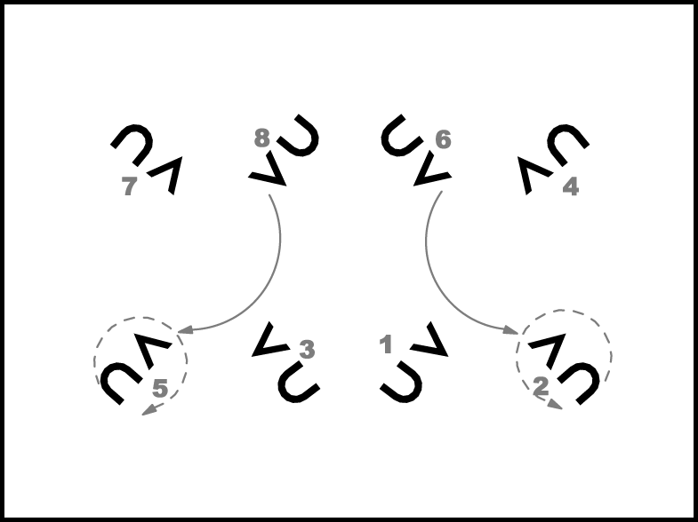 “Viens” – pāri mainās: 1., 2., 4. un 6. – kā parādīts 11a.zīm., 3., 5., 7. un 8. – kā parādīts 11b.zīm.