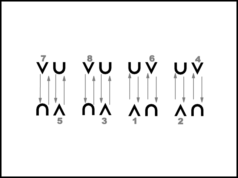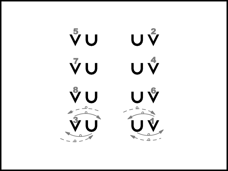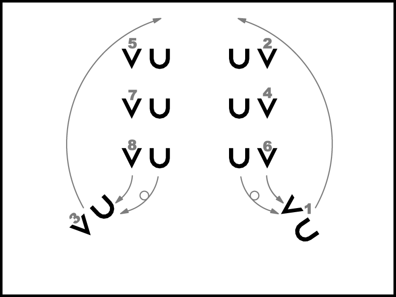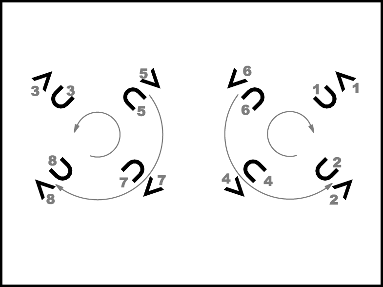 1., 2., 6. un 8. pāris atkārto 2., 4., 5. un 7. pāra 1.- 4. t. darbības. 2., 4., 5. un 7. pāris atkārto 1., 3., 6. un 8. pāra 1.- 4. t. darbības.