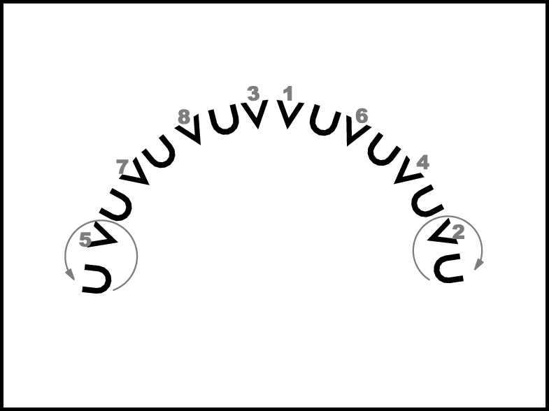 1., 3., 6. un 8. pāris izpilda 1. kustības 2. t. darbības atmuguriski. 2., 4., 5. un 7. pāris, izpildot 1. kustības 2. t. darbības, turpina griezties uz vietas pa kreisi, tā nonākot ar seju uz centru.