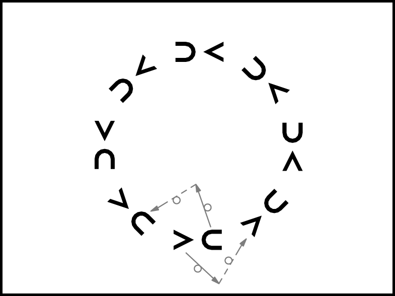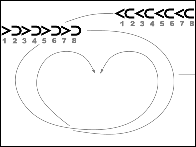 1., 3., 6. un 8. pāris ar 3 gājiena soļiem, sākot ar labo kāju, iet viens otram pretim (7.zīm. bultas); 2., 4., 5. un 7. pāris ar 3 gājiena soļiem, sākot ar labo kāju, pagriežas uz vietas pa kreisi ar muguru pret centru.