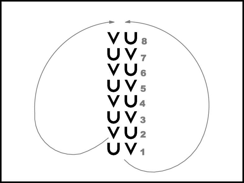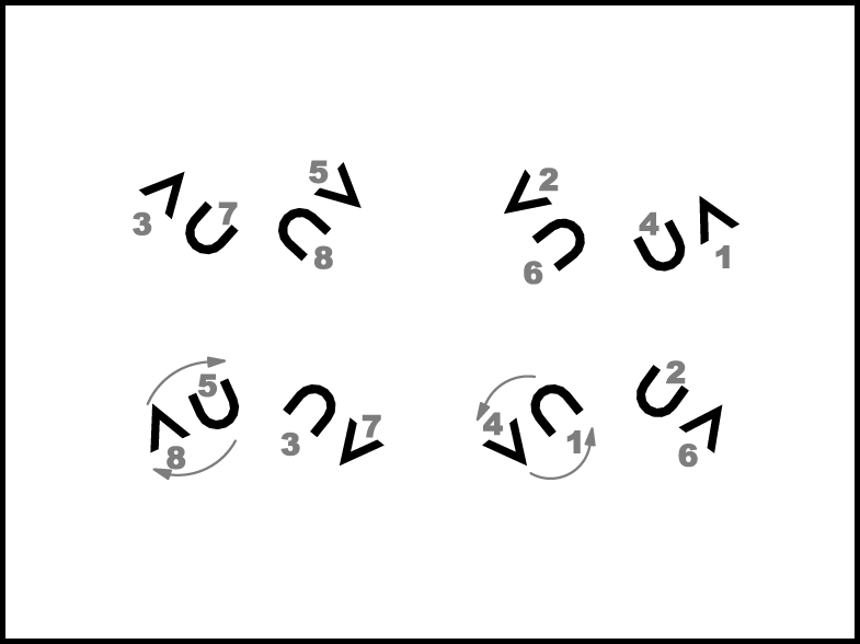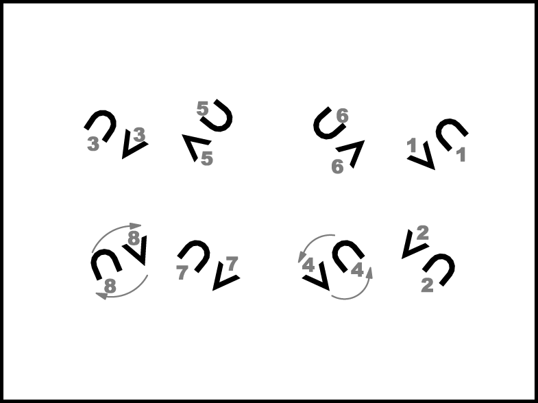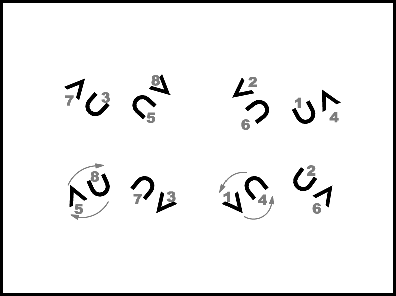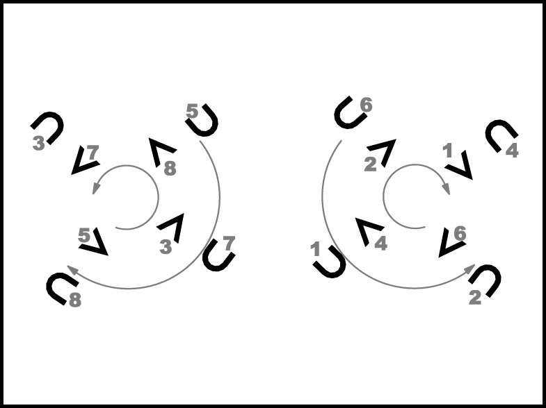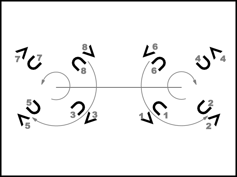 Atkārtojot 1.- 8. t. darbības, pāri nonāk savās sākuma vietās.