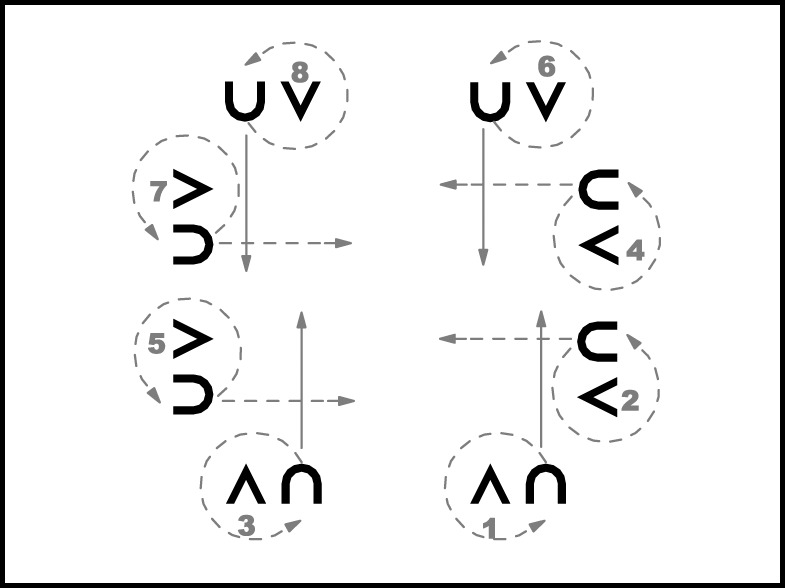 Atkārto 1.- 8. t. darbības 13.zīm. parādītajos virzienos.