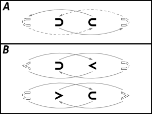 Izpildot 2 reizes 1. kustību atmuguriski, partneri mainās gar kreisajiem pleciem un nostājas viens otram pretī (18a.zīm.).