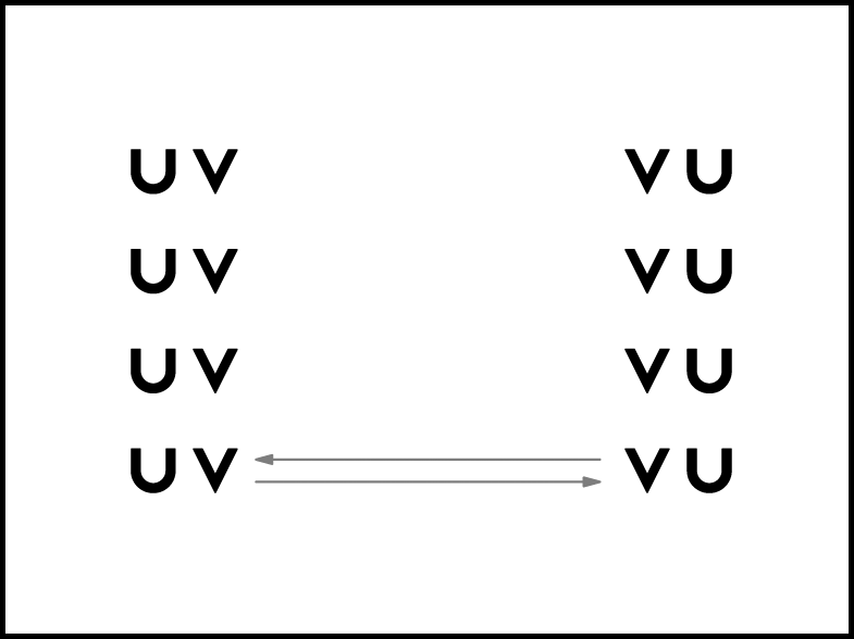 Zēni izpilda meiteņu 1. – 6.takts darbības, maiņu centrā sākot gar kreisajiem pleciem. Meitenes pagriežas pusapgriezienu pa kreisi un izpilda zēnu 1. – 6.takts darbības.