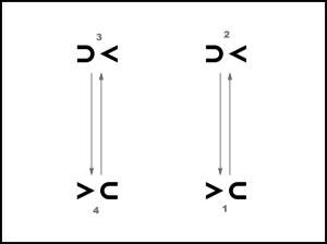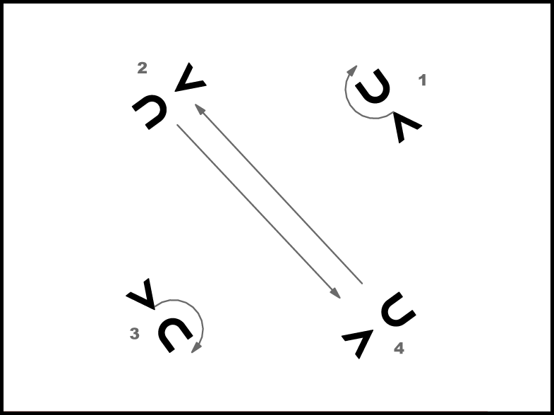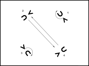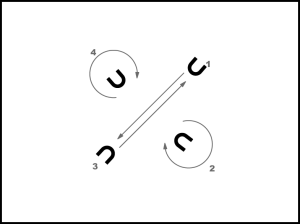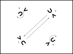 Ar 1. kustību, sākot ar labo kāju, mainās vietām 2. un 4. meita. 2.t. beigās nostājas ar seju uz centru. 1. un 3. meita ar 2. kustību apgriežas uz vietas divreiz apkārt (4.zīm.).