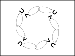 Visi izpilda 2. kustību. Puiši kustību sāk ar labo kāju un virzās pa labi – meitai gar aizmuguri. Meitas kustību sāk ar kreiso kāju un, apgriežoties, pāriet puisim otrā pusē (18.zīm.). Takts beigās partneri satveras vaļējā iekšējo roku satvērienā. Puisis meitai sniedz kreiso, meita puisim – labo roku.