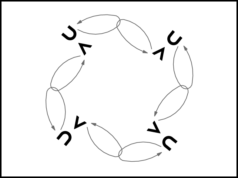 1. un 3. pāris izpilda 5. kustības 3. – 4. t. darbības uz vietas. 2. un 4. pāris ar 5. kustības 1. – 2. t. darbībām mainās vietām (9.zīm.).