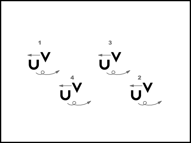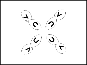 Partneri slēgtā satvērienā griežoties pa dejas ceļu, izpilda 1. kustību divas reizes. 2. un 4. pāris apgriežas 1 V apgrieziena, 1. un 3. pāris 3/4 apgrieziena.