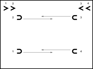 1. un 3. pāris ar 5. kustības 1. – 2. t. darbībām mainās vietām. 2. un 4. pāris izpilda 5. kustības 3. – 4. t. darbības uz vietas (8.zīm.).