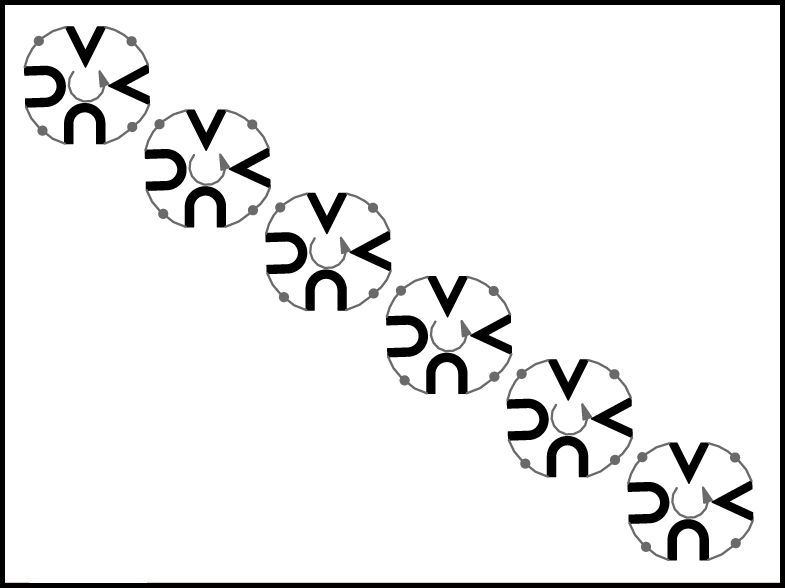 Dejotāji izveido 6 mazus aplīšus un ar 4 polkas soļiem griež tos dejas ceļa virzienā (12.zīm.).