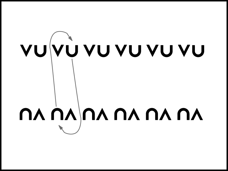 Zēni uz vietas izpilda 2 palēciena soļus un 3 reizes piesit kājas (uz katru palēcienu sasit plaukstas vēzējot tās no augšas uz leju). Meitenes ar 4 palēciena soļiem apmainās vietām gar kreisajiem pleciem un pagriežas pusapgriezienu, nonākot pretī pretējā pāra zēnam (6.zīm.).