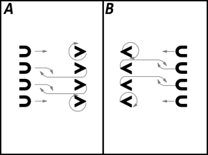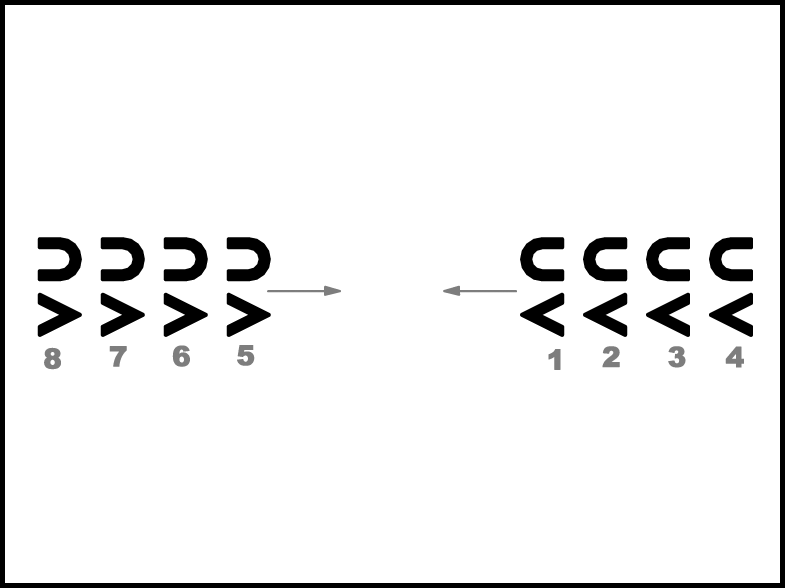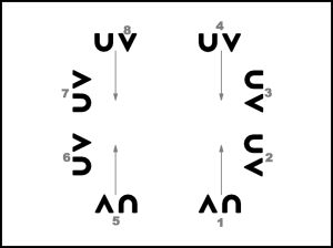 1., 2. un 5., 6. pāris ar 4 gājiena soļiem iet uz priekšu (1.zīm.).