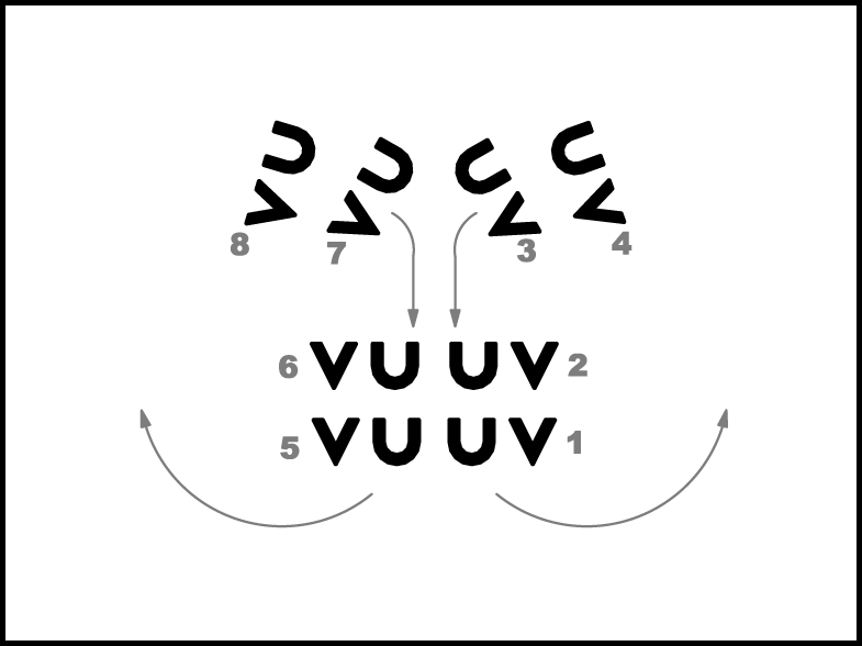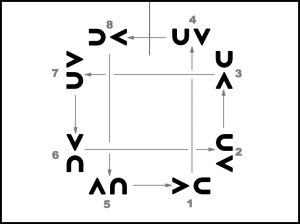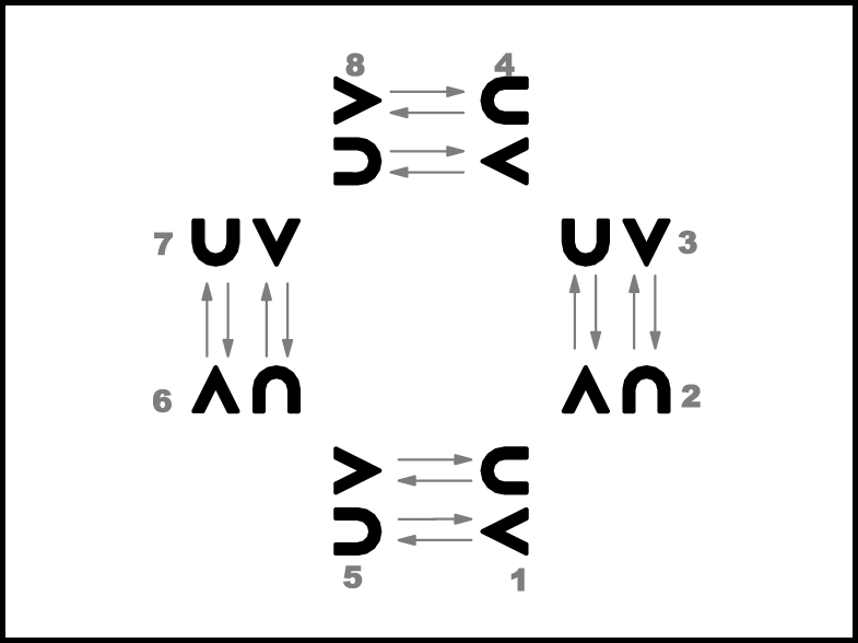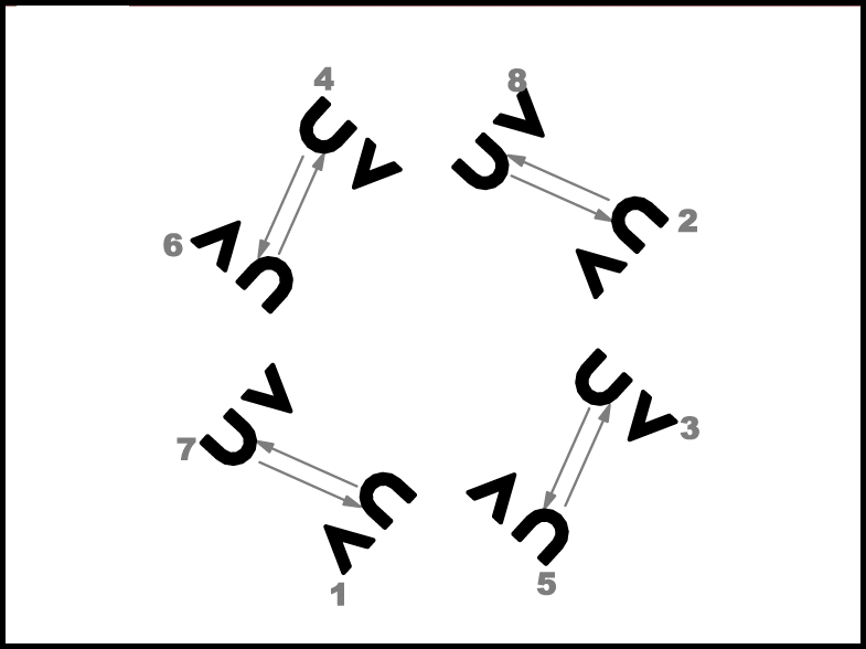 1., 5., 4., 8. pāra puisis atkārto 1. – 4.takts darbības. 2., 3., 6., 7. pāris atkārto 1., 5., 4., 8. pāra puišu 5. – 8.takts darbības (apgriežas pa labi un pārved meitu sev labajā pusē).