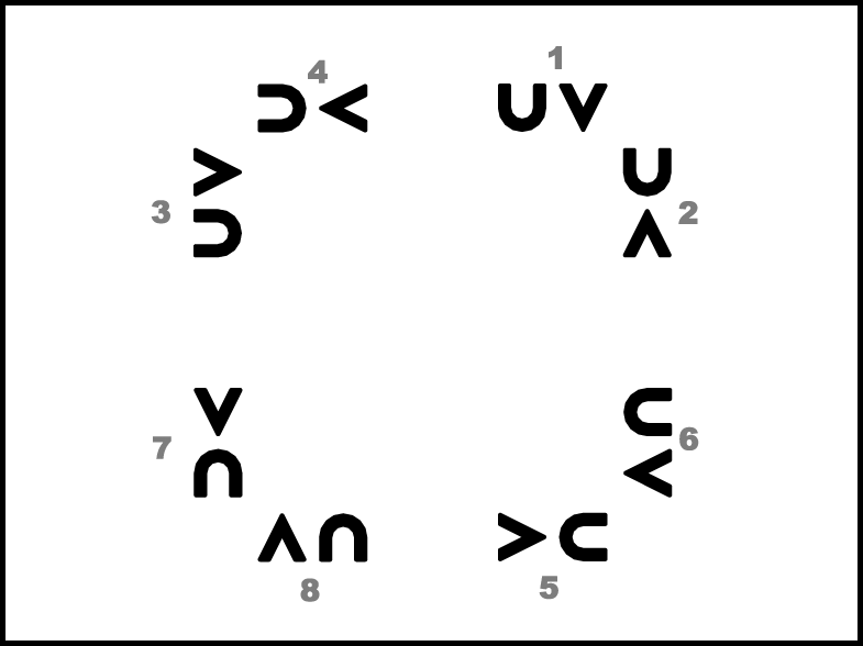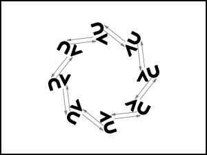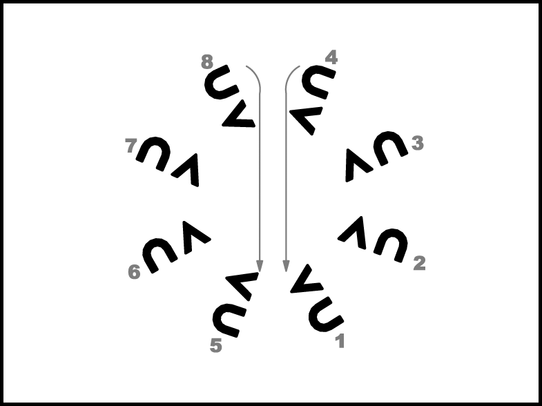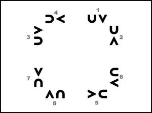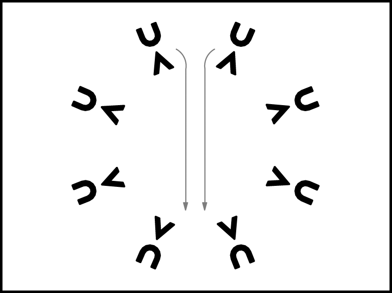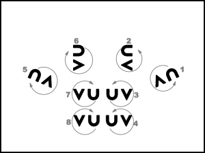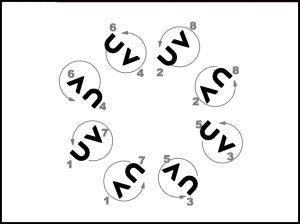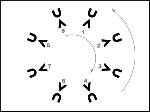 1., 5., 4., 8. pāra puisis apved meitu uz vietas pilnu apgriezienu pa labi (20.zīm.) un 8. taktī pārved meitu no kreisās uz labo pusi. 2., 3., 6., 7. pāris atkārto 1., 5., 4., 8. pāra 1. – 4.takts darbības (iet uz centru).