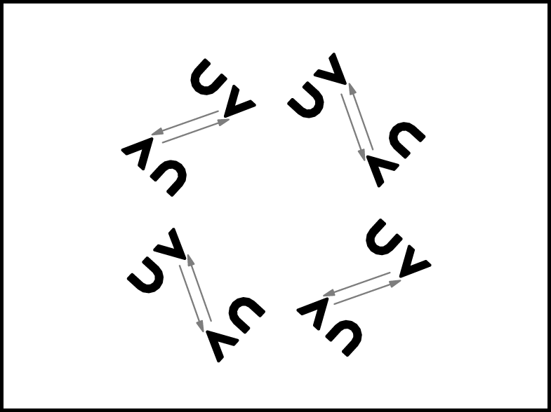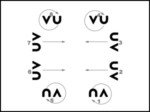 1., 2., 5., 6. pāris atkārto 3. – 4.takts darbības (apiet aplīšus). 3., 4., 7., 8. pāris atkārto 1., 2., 5., 6. pāra 7. – 8.takts darbības.