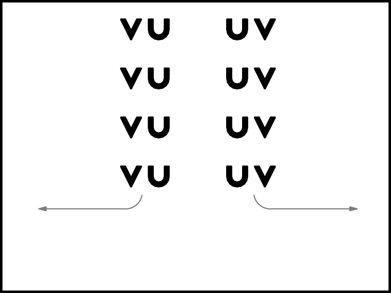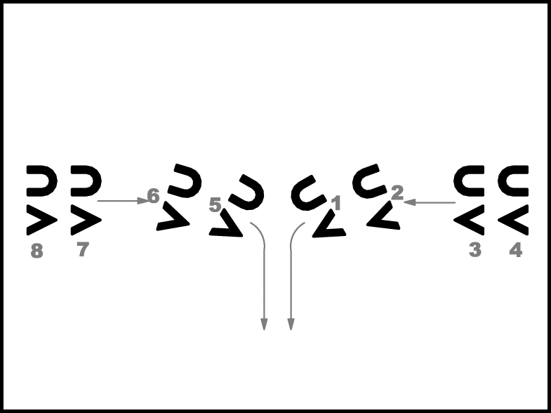 Visi iet 4 gājiena soļus uz priekšu. 1., 2. pāris kolonnā iet uz labo pusi, 5., 6. pāris kolonnā iet uz kreiso pusi. 3., 4. pāris un 7., 8. pāris veido divpāru kolonnu skatuves vidū (5.zīm.).