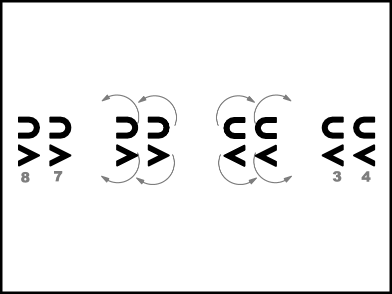 3., 4., 7., 8. pāris izpilda 1., 2., 5., 6. pāra 3. – 4.takts darbības (4.zīm.). 1., 2., 5., 6. pāris 7. taktī iet 2 gājiena soļus uz priekšu.