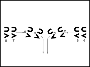Ar 7 galopa soļiem 1., 2., 3., 4. pāris dejo pa dejas ceļu, 8., 7., 6., 5. pāris – pret dejas ceļu. 8.takts beigās ielēciens uz abām kājām 6. pozīcijā. Dejotāji izveidojuši vertikālas kolonnas skatuves vidū (9.zīm. bultas).