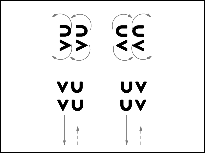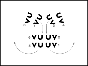 „-vi” – lēciens, atsperoties ar abām kājām. Lēciena laikā kreiso kāju virza uz priekšu, labo – atpakaļ.